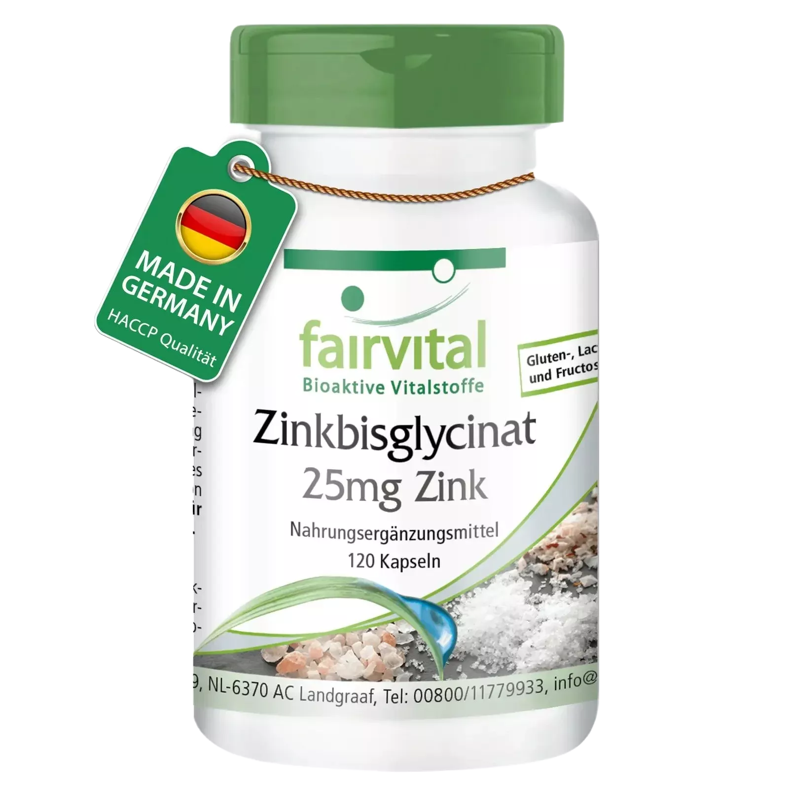 Ovaj dodatak prehrani tvrtke Fairvital sadrži visoku dozu cinka u obliku cinkovog bisglicinata, organskog spoja s vrlo dobrom bioraspoloživošću i može pomoći u nadoknadi ili sprječavanju nedostatka cinka. Svaka kapsula sadrži 25 mg elementarnog cinka.