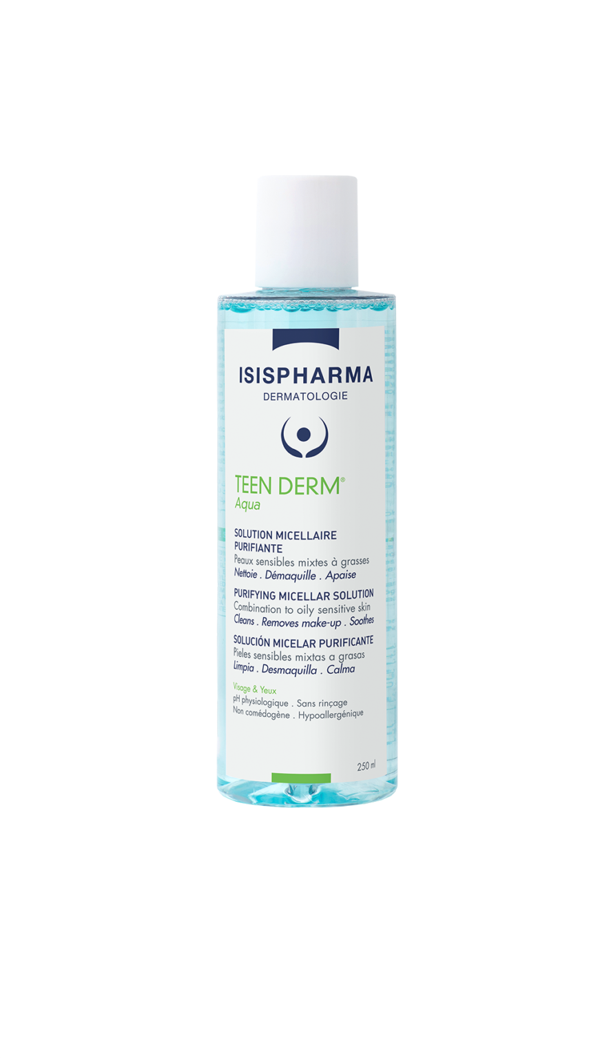 TEEN DERM AQUA je micelarni adstrigentni rastvor, koji čisti i reguliše sebum, a koža ga dobro podnosi. On je posebno formulisan za čišćenje iritirane kože izložene agresivnim tretmanima i tretmanima dehidratacije (antibiotici, izotretinoin). Čišćenje bez ispiranja.