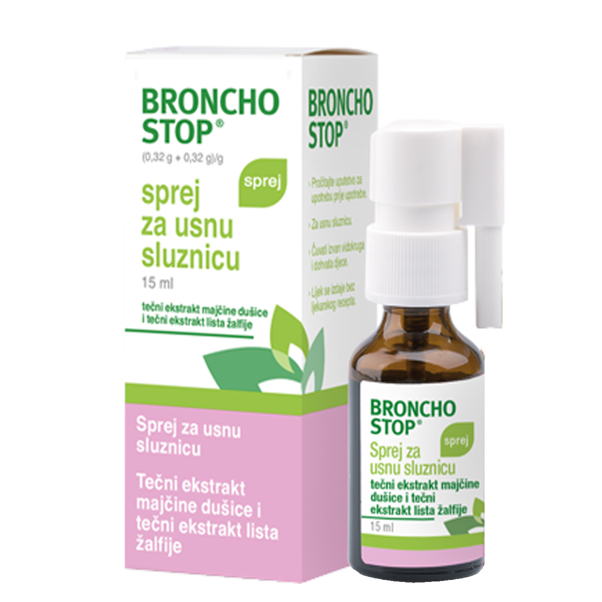 BRONCHOSTOP sprej za usnu sluznicu je tradicionalni biljni lijek koji se koristi za simptomatsko liječenje upala u ustima ili grlu povezanih sa prehladom, npr. upala grla promuklost poteškoće pri gutanju