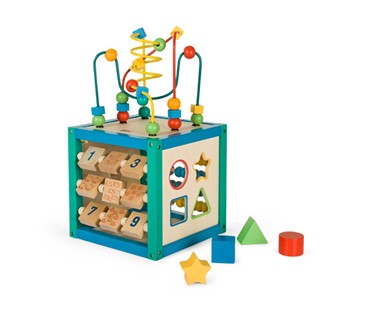 Aktivity kocka je igračka podjeljena na više cjelina. Svaka cjelina je poseban stimulans i odigurava razne mogućnosti individualizovanog oblika rada. Pogodna je i ako imate djecu različitog uzrasta jer je tempo učenja primjeren pojedincu. Svaka aktivnost pospješuje koncentraciju i polako osvješćuje logičke postupke. Djeca sa ovom kockom beskrajno istražuju i otkrivaju osobine i odnose stvari igrajući se, koordinirajući različite akcije i sheme. Djete uvjek ponovno uči, i to na nov način.