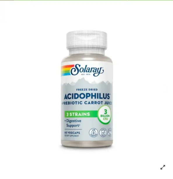 Solaray Acidophilus s prebiotičkom podlogom od soka mrkve sadrži više od 3 milijarde aktivnih probiotičkih kultura po kapsuli. Ova jedinstvena kombinacija pomaže u očuvanju ravnoteže crijevne mikroflore, što može pozitivno uticati na varenje, imunitet i opšte zdravstveno stanje. Redovno uzimanje može doprinijeti prevenciji probavnih smetnji, vaginalnih gljivičnih infekcija i razmnožavanju štetnih bakterija u crijevima.